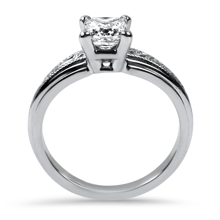 The princess cut diamond measures 4.89x4.75x3.50 mm, and its very good polish and symmetry ensure an exceptional play of light, captivating all who behold it. The shank is a work of art in itself, adorned with an engraved paisley design on its 4mm shoulders that gracefully fades to a high polish at its 2mm base. This ring is a size 4.75 and is stamped "18K JABEL" for authenticity.