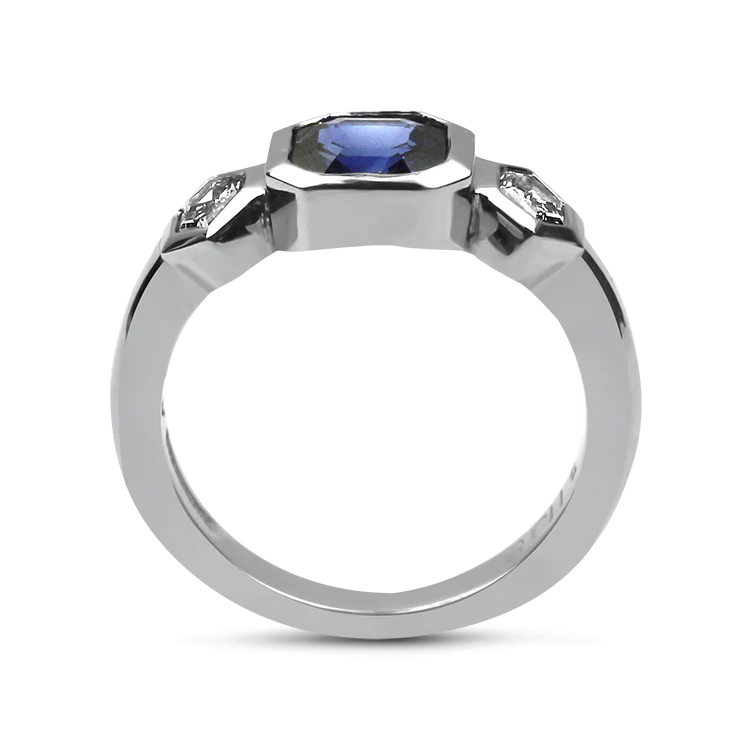 Indulge in timeless elegance with our Platinum Sapphire and Two Diamond Ring. The focal point is a captivating center square step-cut sapphire, weighing 1.38cts and measuring 6.31mm x 6.21mm x 3.83mm. Its slightly violetish-blue hue exudes a medium-dark tone and a captivating, moderate to strong saturation (slvB 6/4½). Light inclusions (Type II L2) add character to this enchanting gem, complemented by a good make, finish, and brilliance.