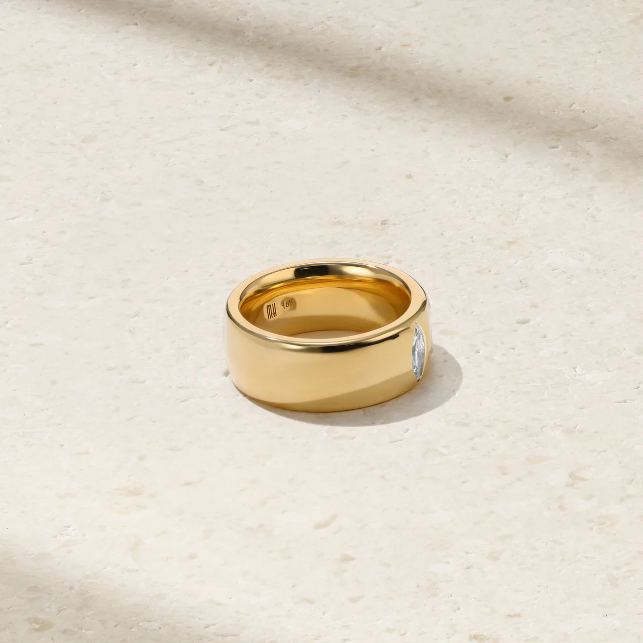 A bold interpretation of a timeless symbol, this wide gold band is punctuated by a sequence of marquise-shaped diamonds, each meticulously flush-set to create a sleek, polished surface. The elongated silhouette of each stone evokes the protective gaze of the evil eye, a motif long revered for its watchful power. Bold yet refined, this statement ring is designed to stand alone or pair effortlessly with other Guardian bands, adding both significance and edge to your daily repertoire.